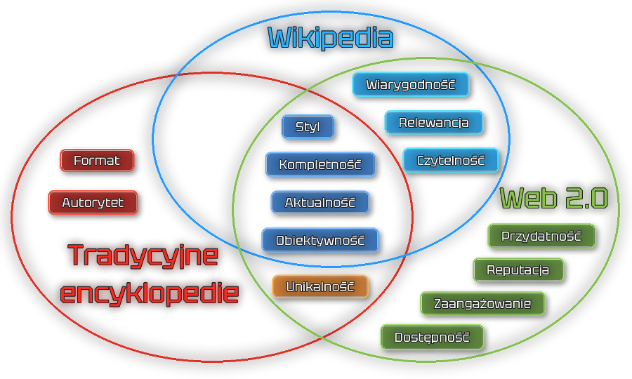 Aby zdefiniować wymiary jakości w Wikipedii, należy wziąć pod uwagę podobieństwo tej witryny do tradycyjnych encyklopedii oraz serwisów web 2.0. Z jednej strony treści w Wikipedii tworzone są jako punkt odniesienia, w stylu encyklopedycznym. Według różnych badań ma ona porównywalną dokładność z innymi tradycyjnymi encyklopediami. Jakość artykułu w tradycyjnej encyklopedii można zdefiniować za pomocą 7 wymiarów: autorytet, kompletność, format, objektywność, styl, aktualność, unikatowość. Z drugiej strony Wikipedia jest zbudowana tak, aby umożliwiać współpracę między użytkownikami. Opiera się zatem na technologiach web 2.0, które posiadają następujące wymiary jakości: dostępność, kompletność, wiarygodność, zaangażowanie, objektywność, czytelność, relewancja, reputacja, styl, aktualność, unikatowość, użyteczność.